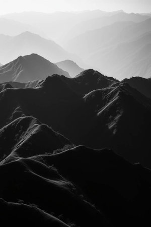 Capture the essence of nature with this tranquil mountain landscape, showcasing layered hills in soft light, creating a serene atmosphere perfect for outdoor enthusiasts.