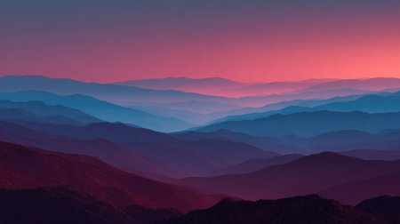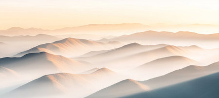 Beautiful dawn scene depicting a layered mountain range with soft pastel gradients and misty horizons, evoking tranquility and a sense of exploration in nature.