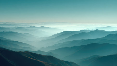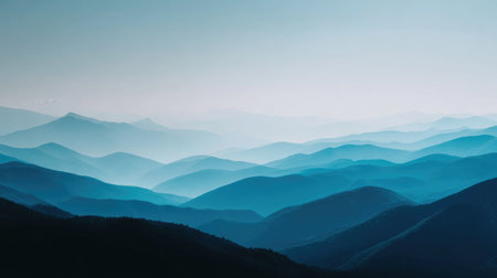 A breathtaking view of misty mountains layered in soft blue tones creates a tranquil and serene atmosphere. Ideal for representing natural beauty and peaceful landscapes.
