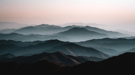 Experience the peaceful beauty of misty blue mountains at dawn under a soft pink sky. This serene landscape captures the tranquility and depth of nature's artistry.