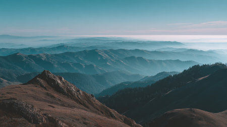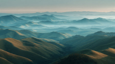 Captivating view of gentle, misty mountains under a serene blue sky. Layers of hills create a tranquil landscape that invites peace and a sense of adventure.