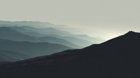 This breathtaking mountain landscape captures the essence of serenity with gentle slopes and soft hazy hues, perfect for conveying tranquility and nature's beauty.