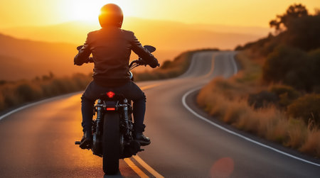 A dynamic view of a rider on a motorcycle cruising along a scenic road at sunset. The imagery captures the essence of adventure and freedom, highlighting a beautiful natural landscape. Perfect for themes related to travel and outdoor activities.