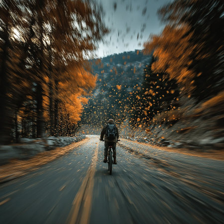 A cyclist rides down a road lined with fall foliage, with leaves scattered around. The motion blur creates a sense of speed and movement through autumn.