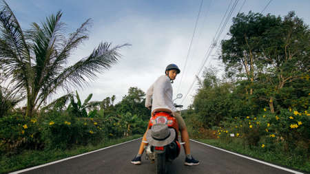 Man on red motorbike in white clothes drive on forest road trail trip. One men caucasian tourist go on scooter, nearby tropical palm tree.
