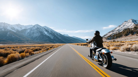 A biker enjoys a thrilling ride on a motorcycle down a serene road, surrounded by majestic mountains and a bright blue sky, epitomizing freedom.