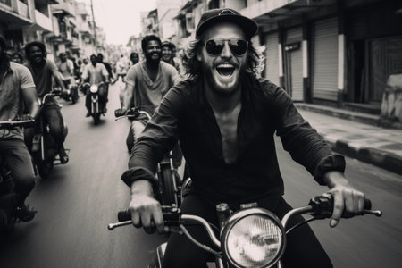 Joyful man riding a vintage motorcycle on a bustling city street, exuding freedom and happiness.