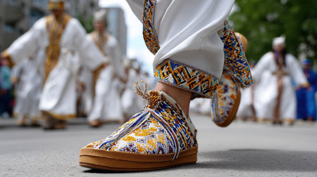 A man wearing a white robe and blue and yellow shoes is walking down a street. The shoes are decorated with a pattern of blue and yellow