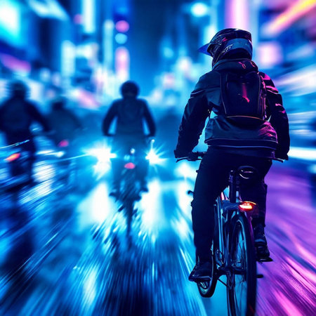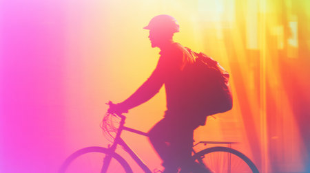 A delivery worker rides a bicycle against a vibrant abstract backdrop of glowing gradients and soft depth effects during the evening hours.