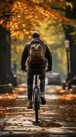 Cyclist riding bicycle in autumn park. Rear view of man riding bicycle in autumnal alley.