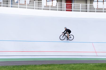 portrait of young professional female athlete racing on a bike. motion blurred image.horizontal orientation