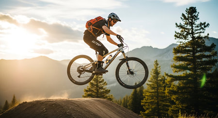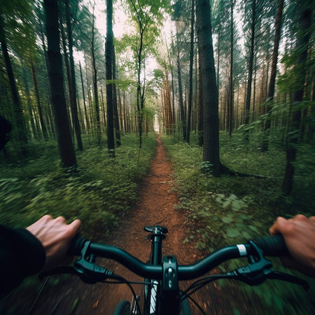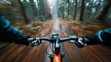 Mountain biker speeding down a trail in the forest, experiencing the thrill of the ride