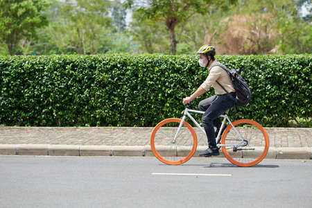 Young businesssman in protective helmet and medical mask riding bicycle