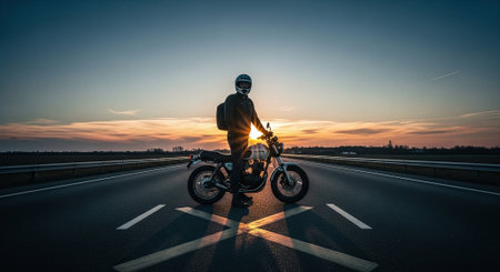 Motorcyclist on the road at sunset. Extreme sport and active lifestyle.