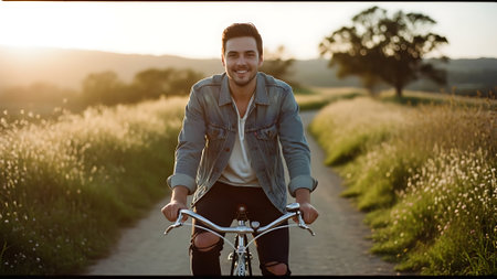 Portrait of a happy young man riding his bicycle in the countryside