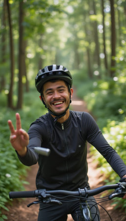A young man with a bright smile rides his bike along a sun-dappled forest path, exuding happiness and adventure. His casual black cycling attire and helmet complement the vibrant greenery surrounding him, creating a lively atmosphere of outdoor exploration.