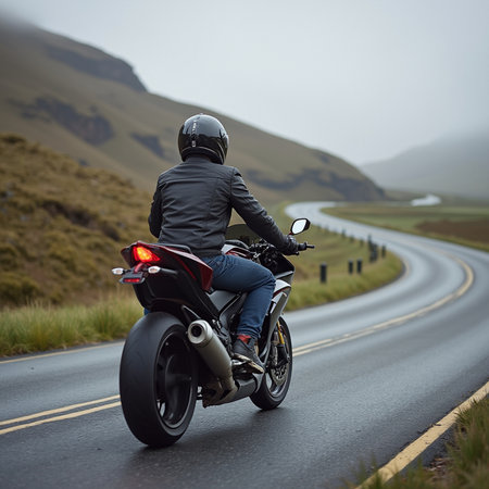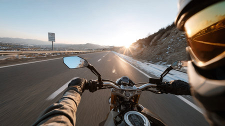 A dynamic view of a rider on a motorcycle cruising along a scenic road at sunset. The imagery captures the essence of adventure and freedom, highlighting a beautiful natural landscape. Perfect for themes related to travel and outdoor activities.