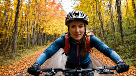 Adventurous woman on a thrilling mountain bike ride autumn foliage blurring dirt spraying exhilarating trail