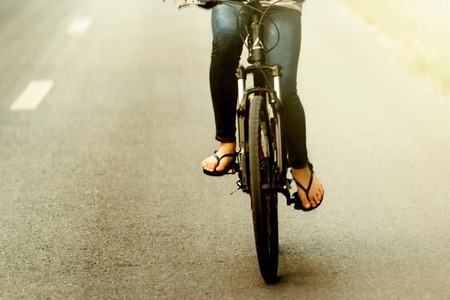 Asphalt car road and spinning bike wheel