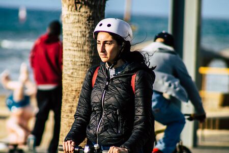 Tel Aviv Israel January 29, 2020 View of unidentified people rolling with an electric scooter in the streets of Tel Aviv in winter