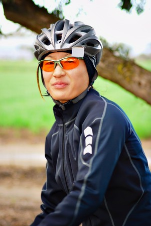 Beautiful asian women is cycling in the sun. She applied the cream and lotion and looked at the camera on a blue background.