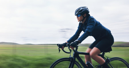 Bicycle, exercise and woman cyclist ride outdoors for fitness, training and workout for wellness and health. Mockup, bike and female person riding as challenge, travel and cycling for cardio