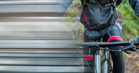 Composition of fit caucasian man riding bicycle in forest with motion blur. sport, fitness and active lifestyle concept digitally generated image.