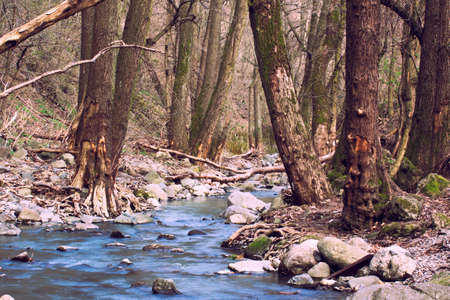 A serene view of a mountain stream in the Great Smoky Mountains. No people, copy space.