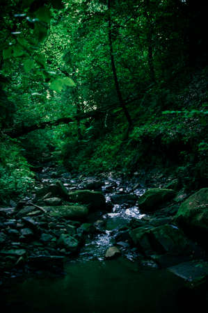 mountain stream in the dark thickets of dense forest on the slope of the mountains