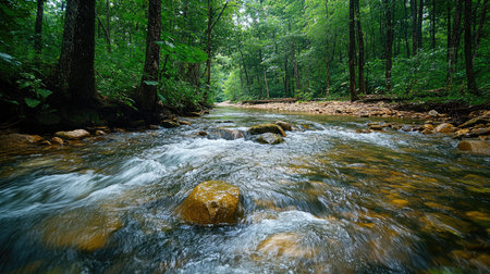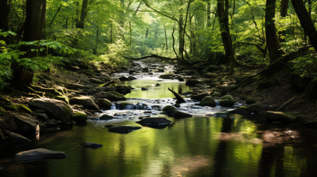 Gentle stream cascades through a sun-drenched forest, creating a tranquil scene. Rocks peek out from the flowing water, reflecting the surrounding verdant landscape.