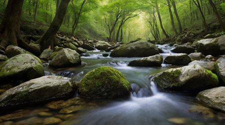 forest creek water illustration serene flowing, lush crystal, reflection greenery forest creek water