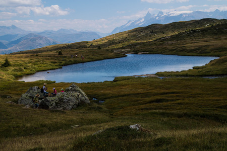 people on the bench, view of the valley in the mountains, switzerland, travel, trekking