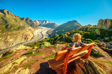 Aletsch Glacier from Moosfluh viewpoint in summer with clear blue sky in Swiss Alps, Valais Canton, Switzerland, Europe. Tourist woman relaxing sitting in a wooden bench looking over glacier.
