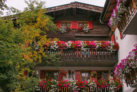 Traditional mountain house with flowering balcony, Livigno, Sondrio, Lombardy, Italy