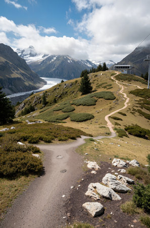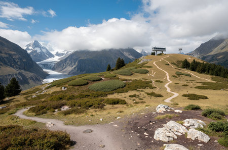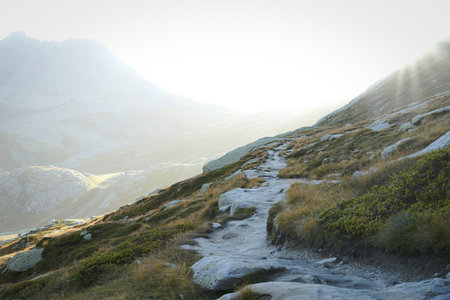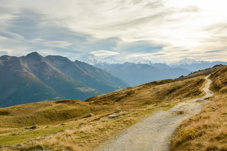 Stunning mountain panorama with hiking trails high up in the Pennine Alps on a cloudy day in summer. Saint-Luc, Valais, Switzerland