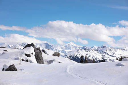 Winter hiking trail, snowcapped mountains with cloudscape, blue sky. Stones at the top of the mountain covered by snow, path in the snow. Swiss alps, Wallis Canton.