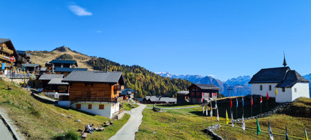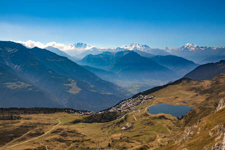 Stunning aerial panorama view of Swiss Alps mountain of Valais (Wallis) and Bettmersee lake above Bettmeralp near Great Aletsch Glacier on sunny day in autumn, blue sky cloud background, Switzerland