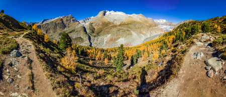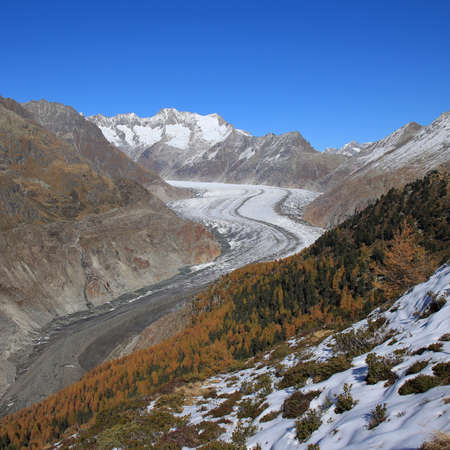Great Aletsch glacier seen from belalp with larch trees. It is the largest glacier of the European Alps. Switzerland.