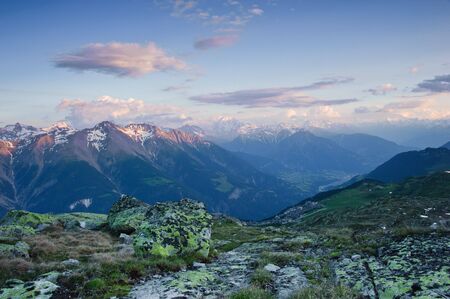 Mountain landscape with snow capped peaks at sunset. Caucasus, Russia