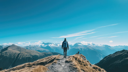 Rear view of one boy with cap standing on rocks and enjoying view of naturer. Aletsch Glacier in Switzerland. Outdoor adventure.