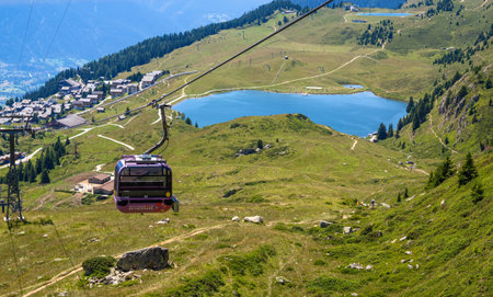 Bettmeralp, Switzerland - July 16, 2022: Cabin cable car from Bettmeralp village to the Bettmerhorn with Aletsch arena
