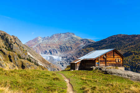 Beautiful view of Aletsch glacier with Eggishorn in background and cottage, sign post on the hiking path in golden autumn, Canton of Valais, Switzerland