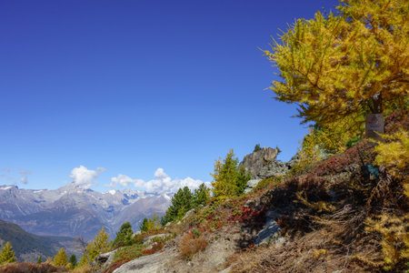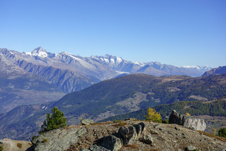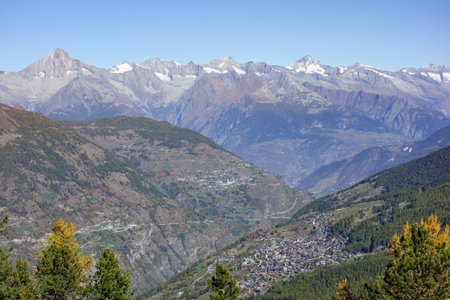 Panoramic view of alpine mountains, Bellwald, Valais, Switzerland, fall season
