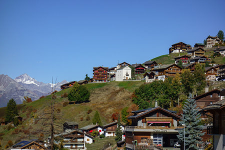Autumn alpine landscape with traditional Swiss wooden houses, Switzerland