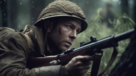 A soldier captured in a dramatic wartime moment displaying courage and intensity.