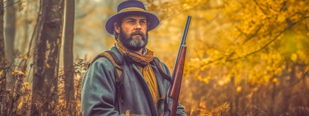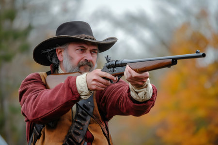 Hunter wearing period costume aiming with antique rifle during a historical reenactment in an autumn forest