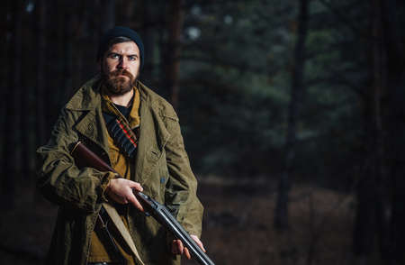 Hunting. Poacher in the Forest. Hunter with shotgun gun on hunt. Hunting is the practice of killing or trapping animals. Trigger of the shotgun.