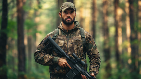 A man stands confidently in a dense forest, dressed in camouflage, holding a rifle during autumn