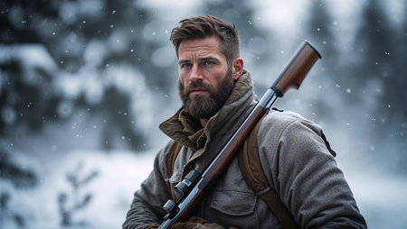 Snowy wilderness warrior stands ready with rifle during winter adventure in the mountains