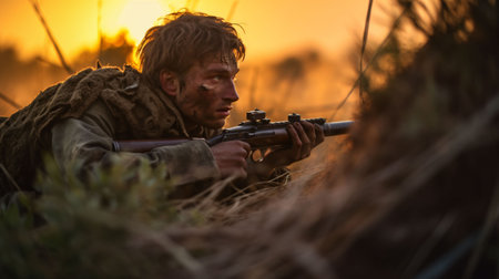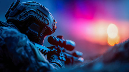 Armed soldier aiming through a scope at sunset, symbolizing military power, precision, and defense.